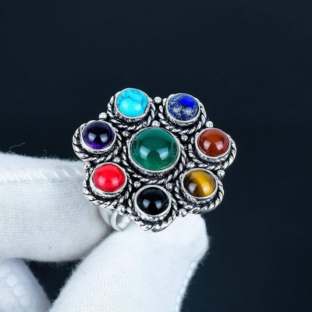7 Chakra Edelstein Handgefertigt 925 Sterlingsilber Ring - Böhmischer Schmuckring - Handgefertigter Boho-Schmuck für Frauen & Männer, Geburtstagsgeschenke