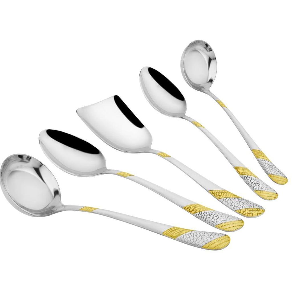 VIELSEITIGKEIT: Dieses 5-teilige Servierlöffel-Set umfasst typischerweise eine Vielzahl von Löffelgrößen und -formen, wie z. B. Suppenkelle, massiv