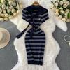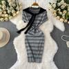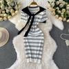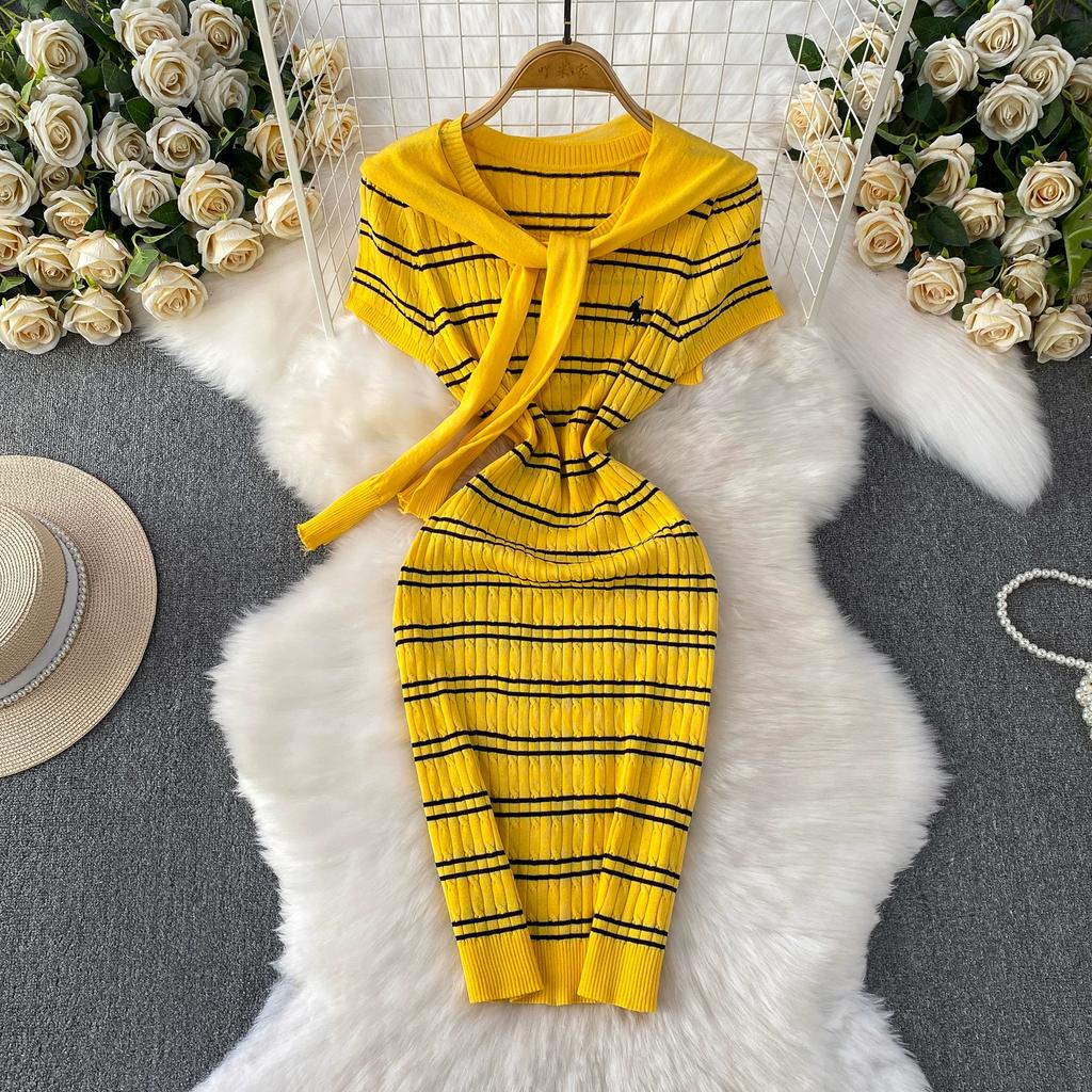 Sommer Damen Casual Kurzarm Gestreifter Strickpullover Mini Etuikleider mit Schal
