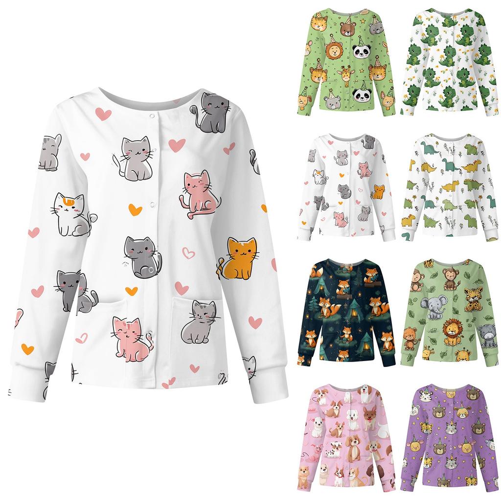 Damen Casual Mode Langarm Stehkragen Einreiher Niedlich Tierisch Bedruckt Arbeitsjacke Oberteile