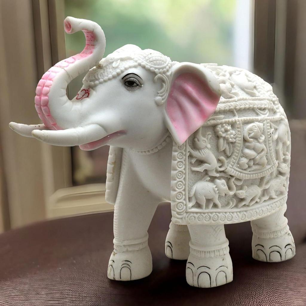 reinweiße Elefantenfigur. Dieses 8x9x3 Zoll große, sorgfältig aus hochwertigem weißem Marmor und Harz handgefertigte