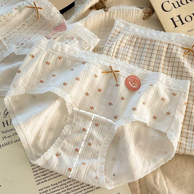 Baumwolle Landhausstil Floral Mid Waist Slips Hautfreundlich und Nahtlos Umhüllte Gesäßpartie und Antibakterielle Damenunterwäsche