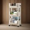 Ein weißes Kunststoff-Bücherregal mit 3/5 Fächern, einem beweglichen Schreibtisch und einem Stifthalter - moderner Stil, offenes Bücherregal, Räder für einfache Bewegung,