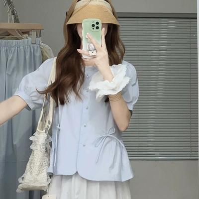 Sommer Blau Puffärmel Hemd Französischer Lässiger Stil Damen Freizeit Kurzarm Oberteil Petite Mode
