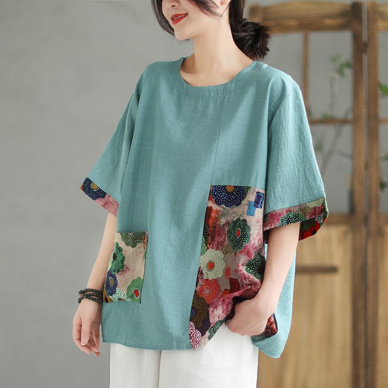 Vintage Bedrucktes Oberteil Locker Kurzärmeliges T-Shirt Damen Sommer O-Ausschnitt Lässig Einsätze Tasche Tee Tops Weiblich 2025 Neu