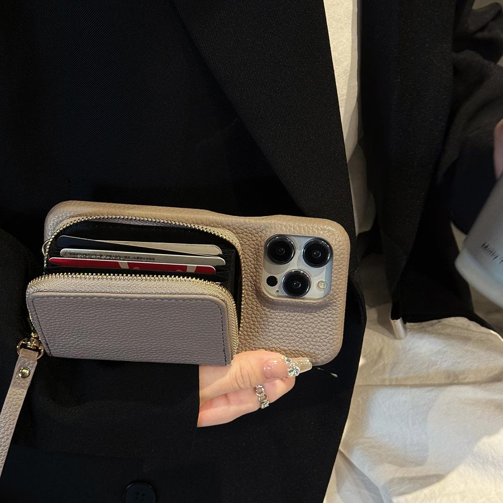 For iPhone 16 Pro Max Case Zipper Card Slots PU Leather Phone Back Cover with Wrist Strap