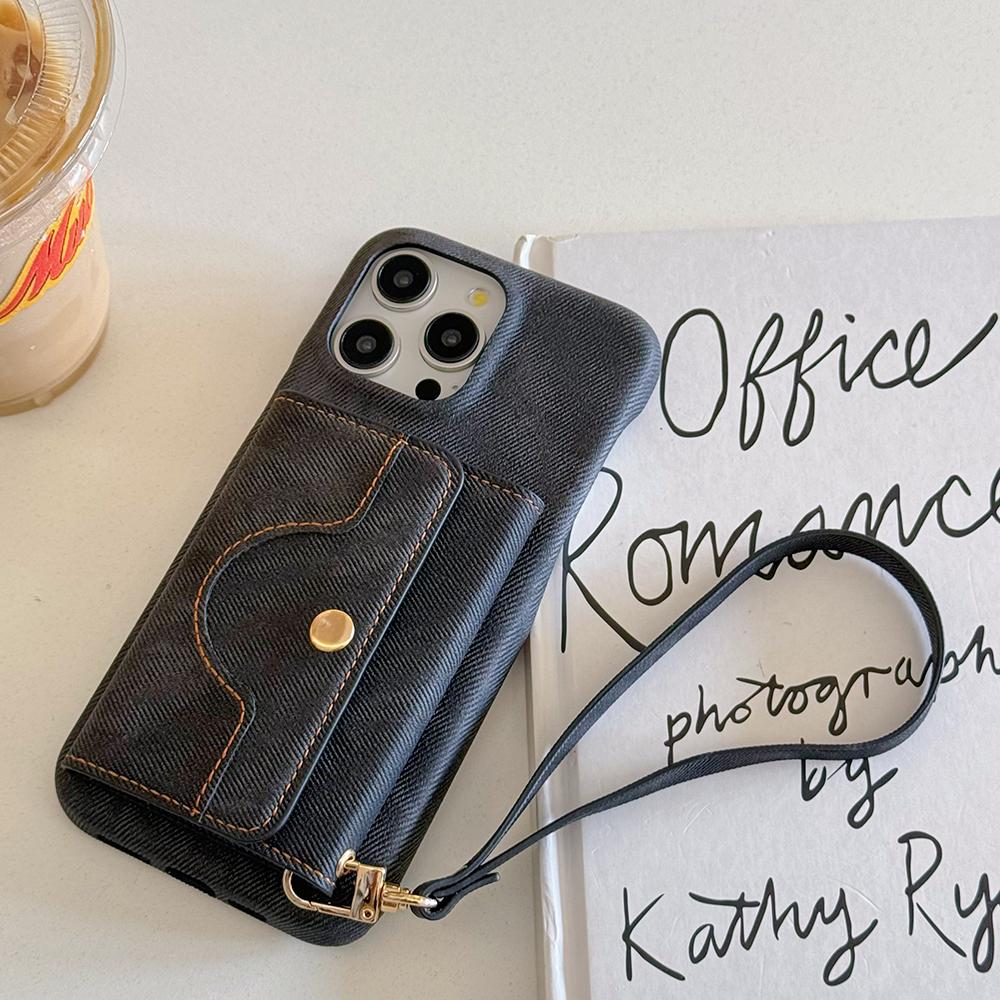 Für iPhone 16 Pro Hülle Kartenfächer Spiegeldesign Jeansstoff Textur PU Leder Rückseite mit Trageband