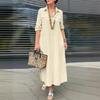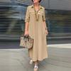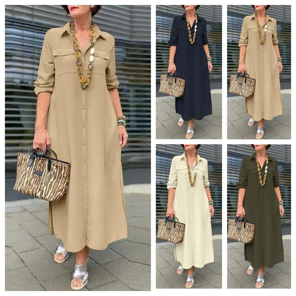 Das Hemdrevers, die Knöpfe, die zwei Taschen, der lockere Schnitt und die gespleißten Faltendetails verleihen dem Kleid einen Hauch von Eleganz und einen schlankmachenden Effekt.