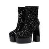 Übergröße Paillettenstoff Patchwork Lackleder Hohe Dicke Absätze Mode Laufsteg Kurze Stiefel Plateau Reißverschluss Bling Stiefeletten