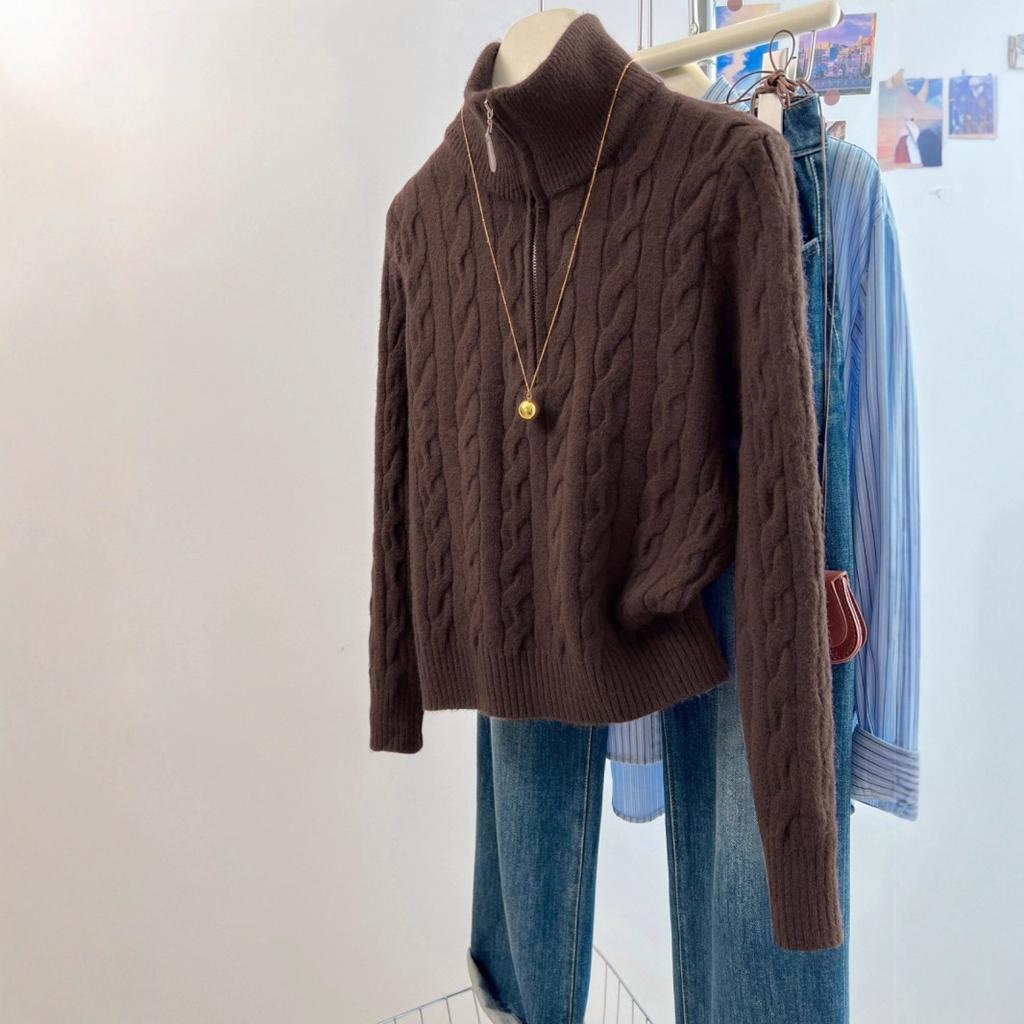 Retro stand-up collar half-zipper twist sweater for women's autumn and winter fashion high-end sense soft waxy outer knitted top for women