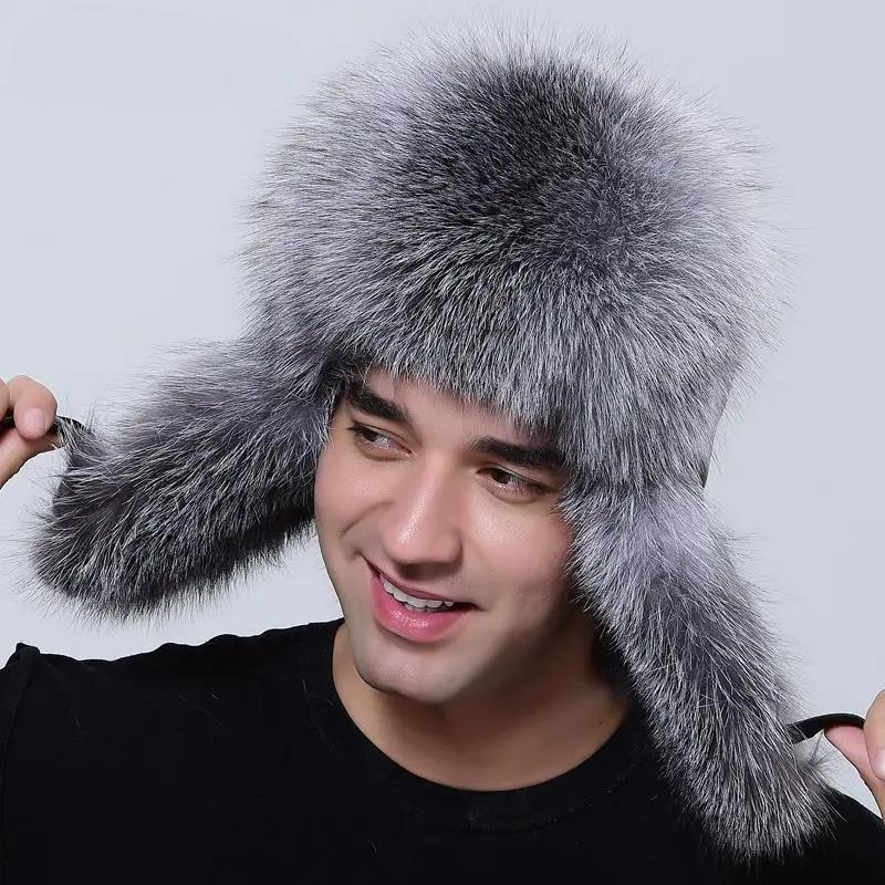 Luxury Men Bomber Hat Winter Warm Thick Fluffy Natural Fox Fur Trapper Ear Hats