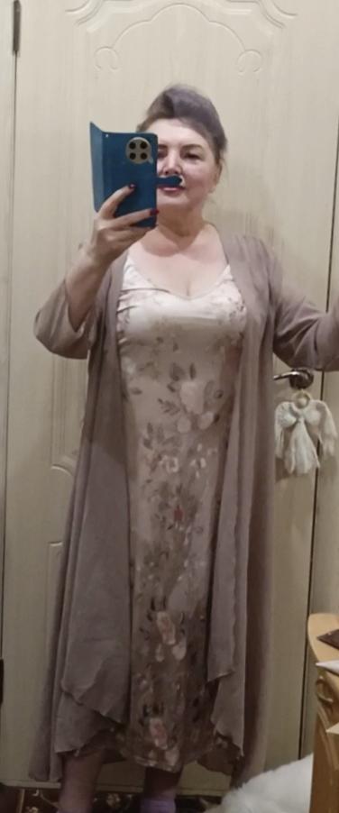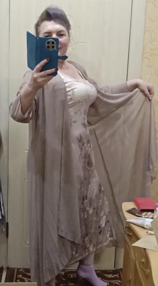 Das Zweiteilige ist wunderbar und sitzt schön. Der Cardigan ist aus Chiffon.. Für 50-52 hat es sehr gut gepasst