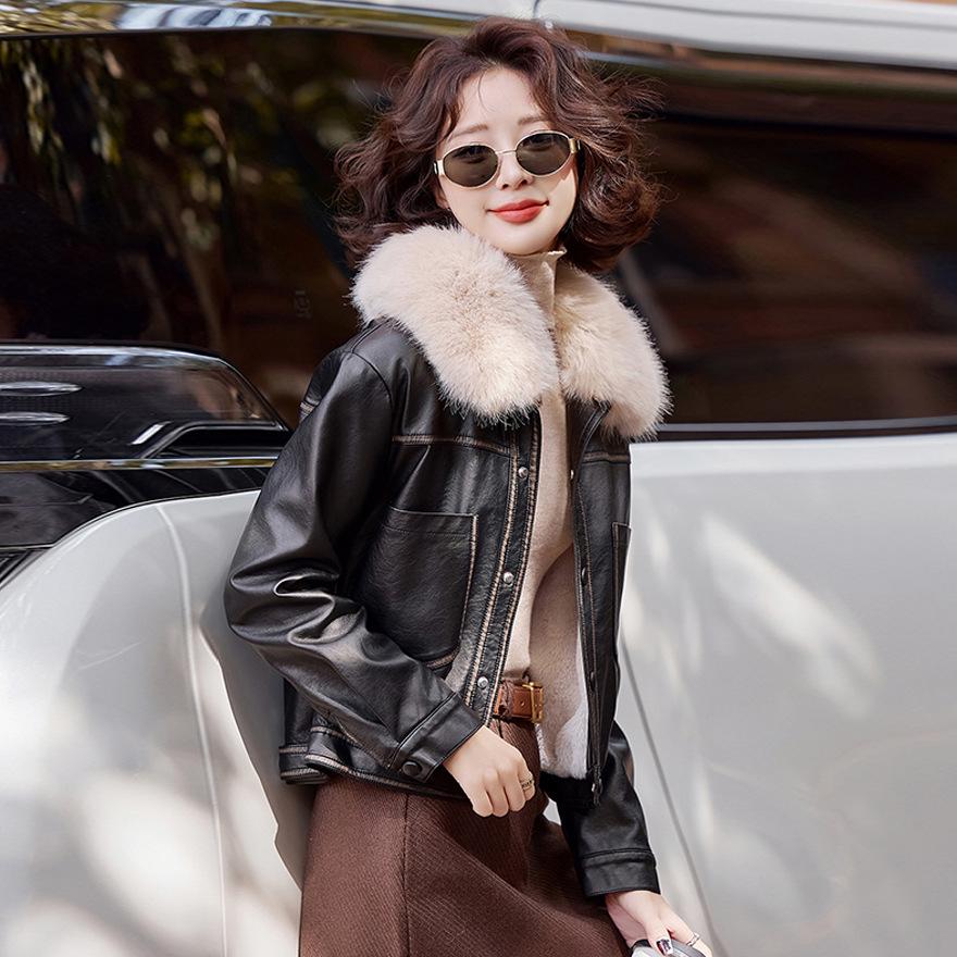 Fleece thickened leather jacket short coat women's winter new thin leather jacket motorcycle jacket top