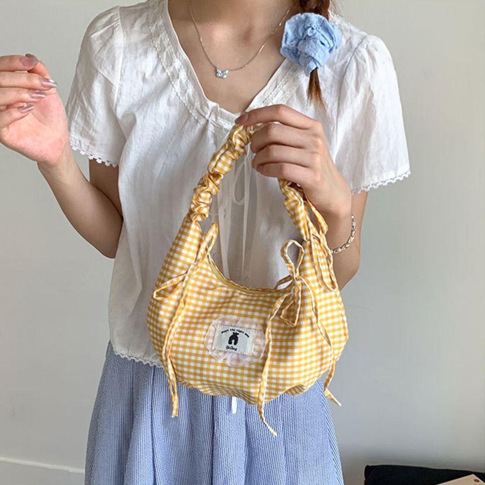Pleated Bow Shoulder Bag Ruffles Underarm Bag All Match Plaid Armpit Bag Handbags