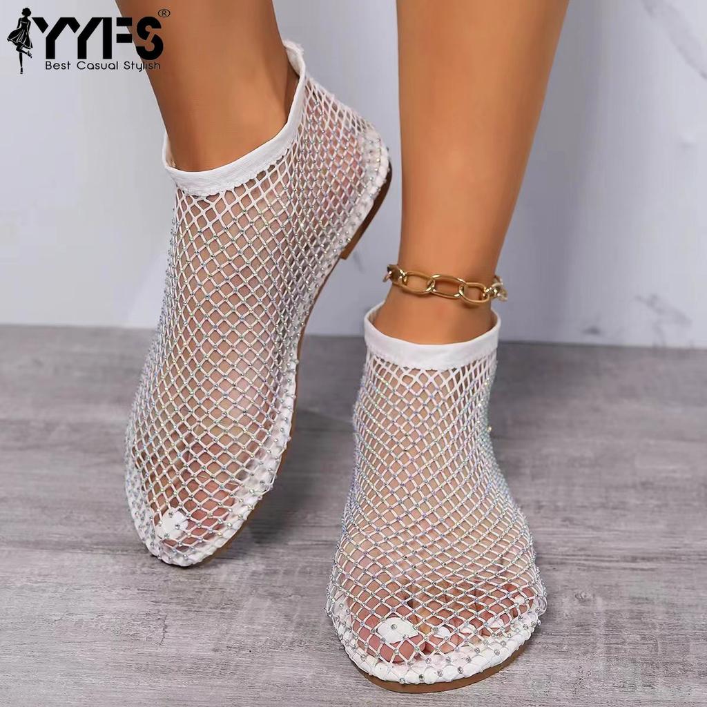 Summer Round Toe Sandals Short Boots Red Mesh Diamond Sexy Cross-Border Plus Size Flat Shoes