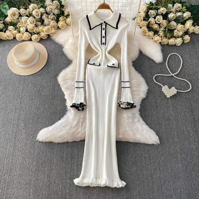 Frühling Herbst Damen Vintage Hepburn Stil Schwarz Langarm Strickpullover Slim Fishtail Kleider