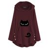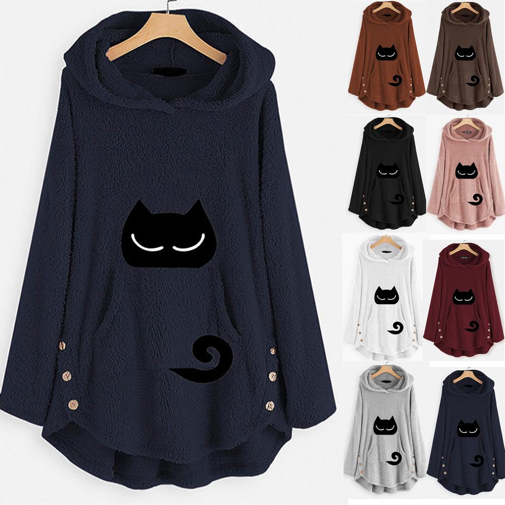 Damen Katzen Plüsch Oberteil mit einfarbigem bedrucktem lässigem Langarm-Kapuzenpullover