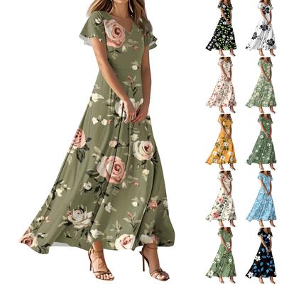 Damen Sommer Casual Fashion Blumendrucke Kleider V-Ausschnitt Kurzarm Kleider