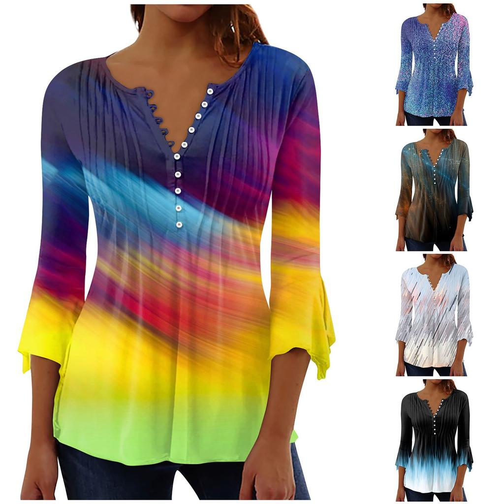 Damen Bluse mit Knopfleiste, Blumenmuster, Oberteil, Sommer, lässig, 3/4-Ärmel, V-Ausschnitt