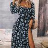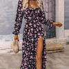 Blumenkleid mit quadratischem Ausschnitt - Langarm Maxi mit Schlitzsaum