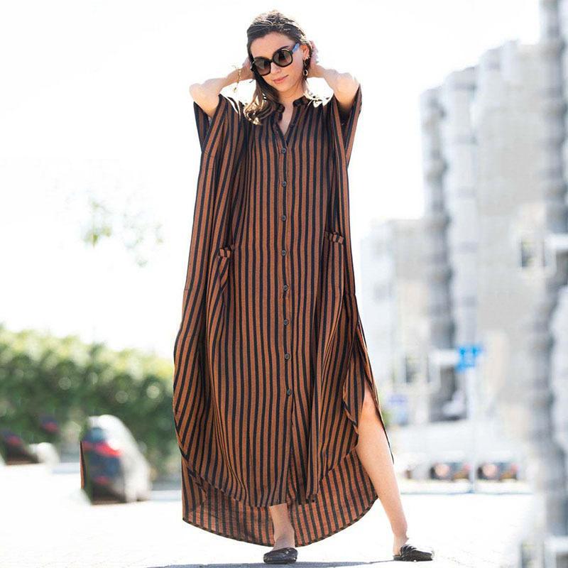 2021 Europäischer & Amerikanischer Gestreifter Strand-Überwurf - Vier-Wege-Stretch, Sexy Schwarzer & Brauner Langer Morgenmantel, Einreihiger Bikini-Überwurf.