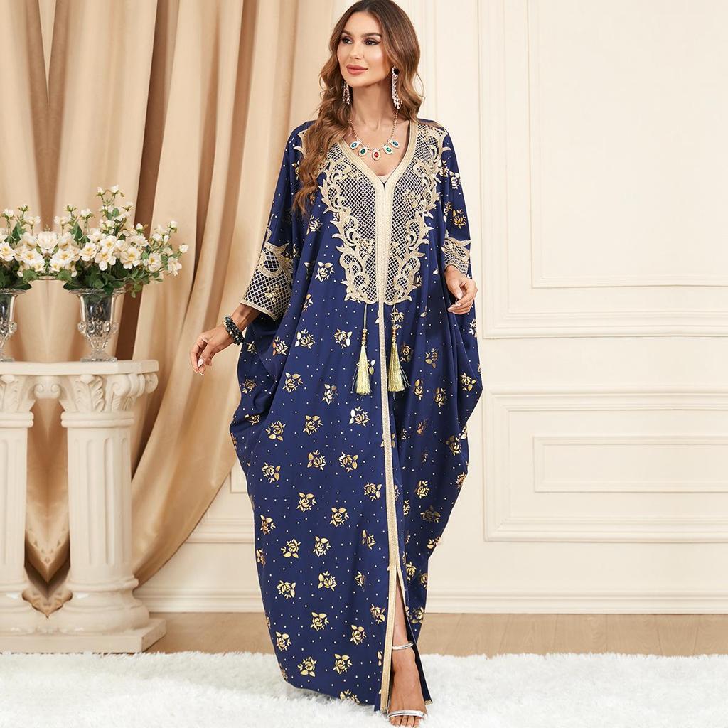 3470 Übergröße Muslimisches Damen Langarm Quastenkleid mit Patchwork für Frühling/Sommer