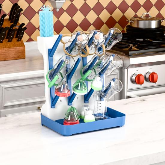 Dieser Ständer ist für eine Vielzahl von Flaschengrößen, einschließlich Glasflaschen, konzipiert und verfügt über ein einzigartiges aufrechtes Design, das mit seinem 72-Grad-Winkelständer ein schnelleres Trocknen fördert.. Der vertikale Luftstrom lässt Wasser leicht abperlen und hält Flaschen, Sauger und Brustpumpenteile trocken und sorgt für eine sorgenfreie Aufbewahrung.