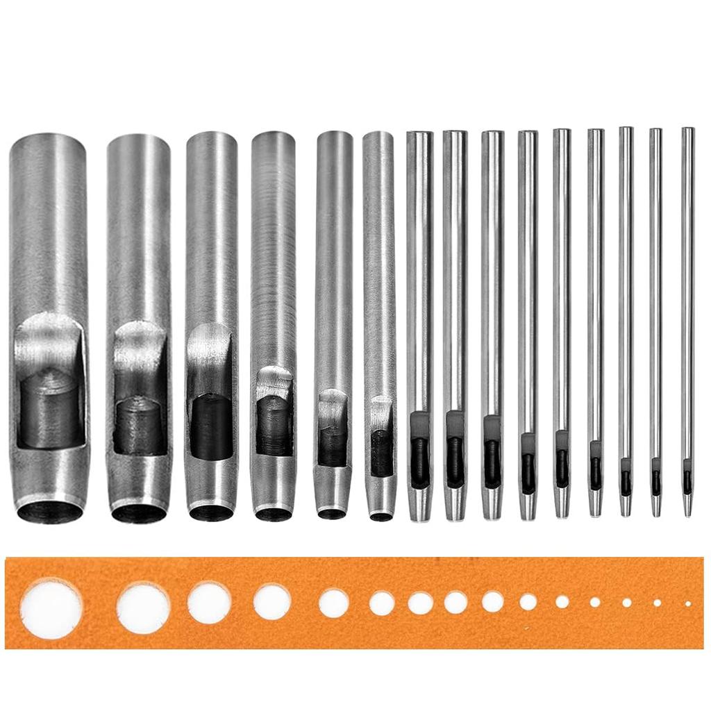 Dieses Locher-Set ist in 15 verschiedenen Größen erhältlich und besteht aus strapazierfähigem, verschleißfestem Kohlenstoffstahl mit einem scharfen Lochkopf, was es zu einem sehr praktischen Leder-Lochwerkzeug-Set macht, mit dem schnell Löcher in Leder gestanzt werden können.