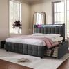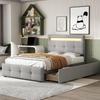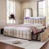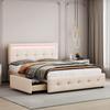 Polsterbett 90x200 cm LED-Beleuchtung, USB-Lade, Einzelbett Bettgestell, Lattenrost, Stauraum, 2 Schubladen, Leinen, Beige