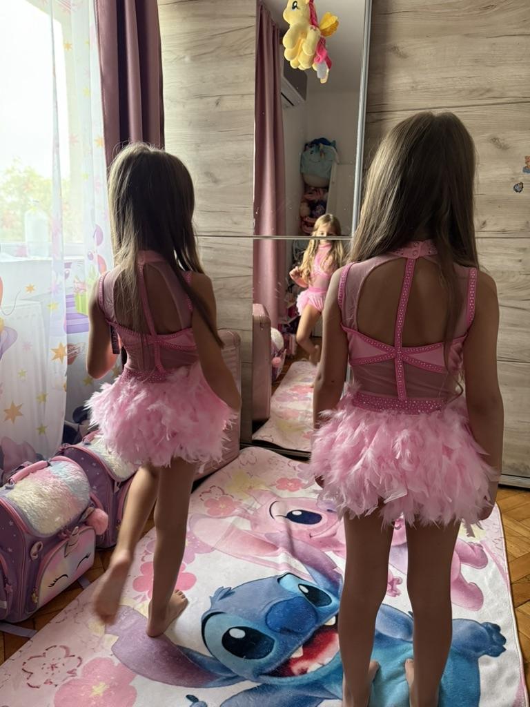 Mädchen Latein Tanzkostüm Ärmellos Ausgeschnittener Rücken Glänzende Strasssteine Colorblock Trikot Federrock Outfit