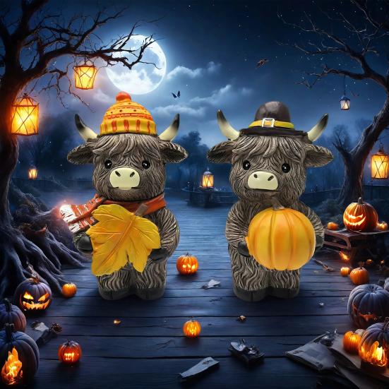 Das festliche Design zeigt eine Hochlandkuh mit einem Zaubererhut und einem gelben Schal, die einen Besen hält, sowie eine weitere Kuh mit einem Skeletthut und einem Halloween-Kürbis.. Dieses Set aus strapazierfähigem Kunstharz ist regenfest und beständig gegen Risse oder Verformungen..