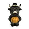 Festlicher Charme: Verschönern Sie Ihre Halloween-Dekoration mit diesem skurrilen Hochlandkuh-Ornament, das einen Zauberhut und einen gelben Schal trägt und einen Besen hält.. Eine weitere Kuh trägt einen Skeletthut und hält einen Halloween-Kürbis, was Ihrem Raum eine einzigartige und festliche Note verleiht.