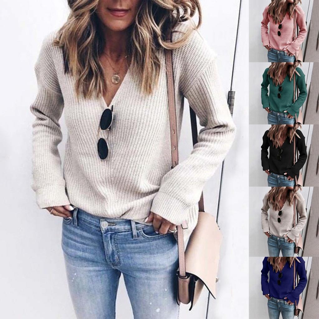 Damenmode Casual Slim Fit Langarm Strickpullover mit V-Ausschnitt