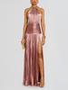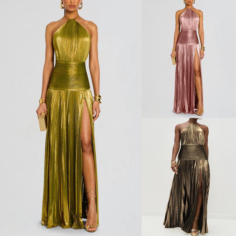 Damen Olivgrünes Metallic Neckholder Bodycon Schlitzkleid