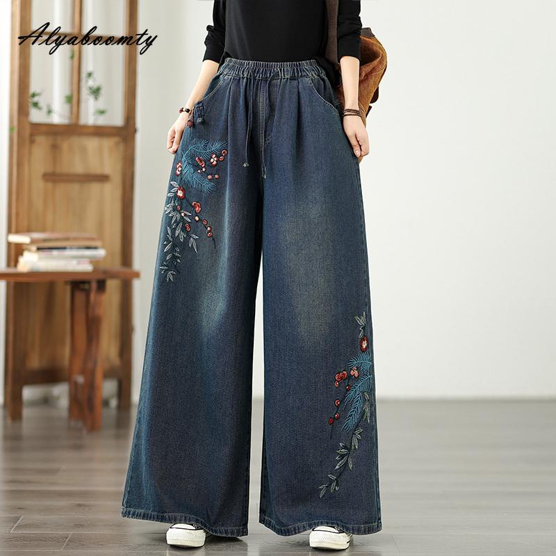 Ethnischer Stil Übergröße Damen Basic Weitbeinjeans Hohe Taille Kordelzug Zarte Stickerei Floral Baggy Denimhose Vintage Elegante Damenjeans