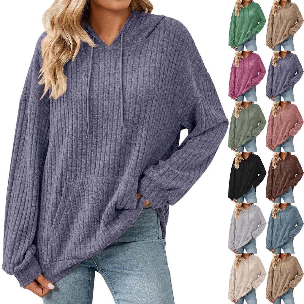 Damen Modischer Lockerer Langärmliger Kapuzenpullover mit Kordelzug und Tasche, Einfarbiges Oberteil