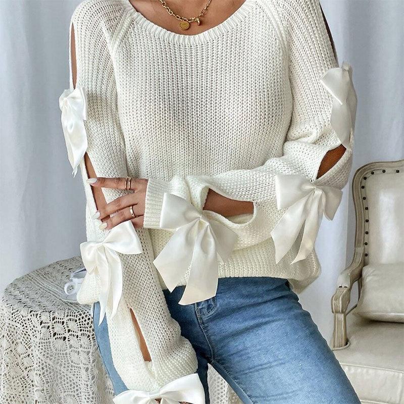 Damen Herbst Winter Pullover und Strickwaren Rundhals Schleife Langarm Strickpullover Tops