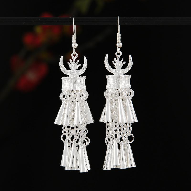 Miaozhai Serie Miao Silberschmuck Horn Ohrringe Retro Lange Glocke Quaste Yunnan Miao Ohrringe