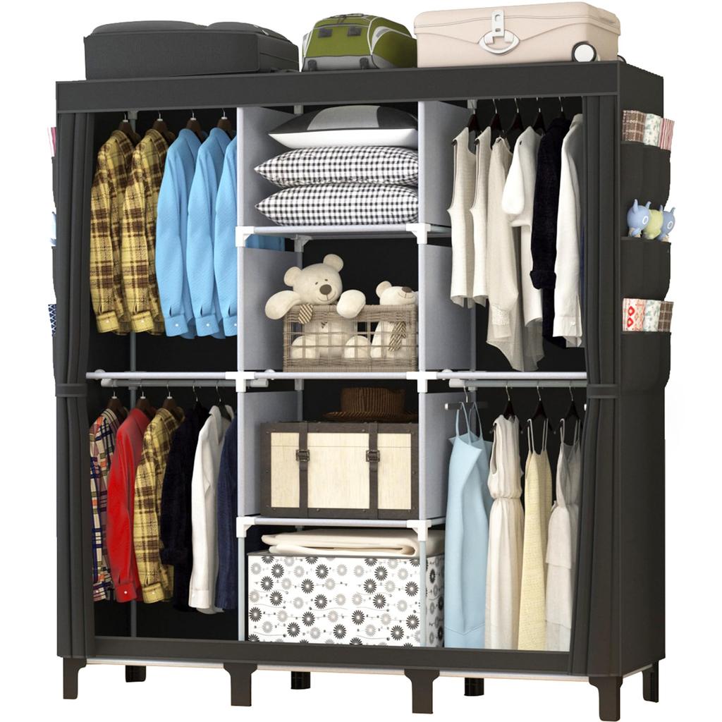 Ein magisches Aufbewahrungserlebnis! Dieser beliebte Kleiderschrank, der durchweg zu den Top-Produkten zählt, verwandelt Ihr Zimmer im Handumdrehen in einen ordentlichen Raum! [Größe: [130cm B x 45cm T x 172cm H] Dieser multifunktionale Kleideraufbewahrungsschrank kann sowohl als Kleiderschrank als auch als Kommode verwendet werden. Seine überlegene Speicherkapazität, mit vier Hängebereichen, vier Faltbereichen und 18 cleveren Taschen, ermöglicht es Ihnen, alles von Hemden und Hosen bis hin zu Bettzeug, Taschen und Socken auf einen Blick zu organisieren.. Ein Lebensretter für kompakte Wohnungen, dieser einfache Schrank mit seiner ultraflachen Tiefe von 45 cm passt auch in enge Räume.. Die Kleiderständerfunktion verhindert das Knittern der Kleidung, und die Schrankhüllenversion bietet staubdichte Reißverschlüsse für einen 24-Stunden-Kleidungsschutz.. Der robuste Stahlrohrrahmen kann über 10 kg pro Regalboden tragen, was ihn zu einem sicheren und zuverlässigen Kleiderständer macht.. Diesen Schrank in 10 Minuten zusammenzubauen ist einfach, sogar für Frauen, ohne dass Werkzeug erforderlich ist.. Es kann aufgerollt und beim Umzug getragen werden, was es ideal für Mietwohnungen macht.. Es eine wirklich moderne Aufbewahrungslösung, die alle Ihre Aufbewahrungsprobleme löst!