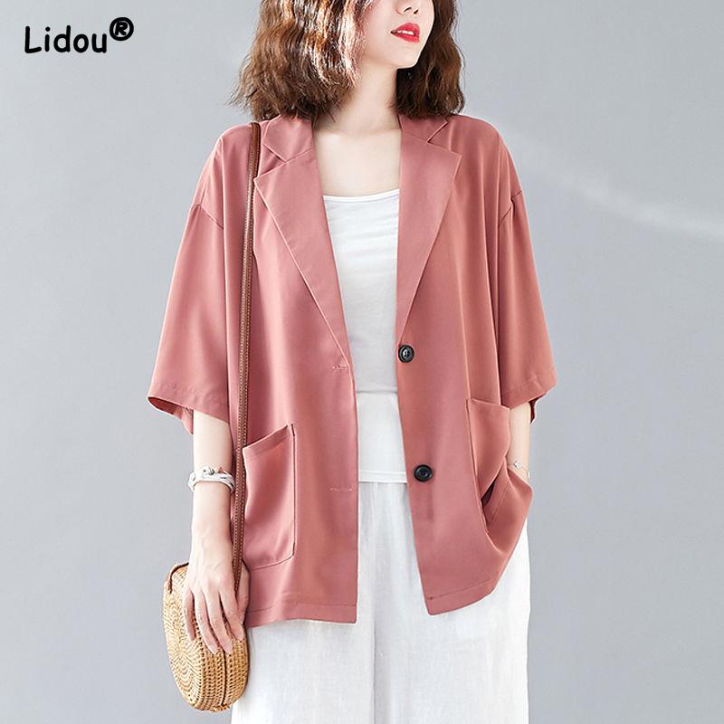 Lässig Locker Koreanische Büro-Lady Mode Gerade Schlichtheit Knopf Blazer Taschen Sommer Dünn Revers Damen Einfarbig