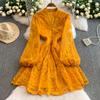 2025 Sommer und Herbst Vintage Hof V-Ausschnitt Laternenärmel Mode Stickerei Vielseitig A-Linie Elegantes Kleid