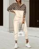 Damen Stilvolles Outfit Set Blau Weiß Lässige Anzüge mit Goldbesatz Schwarz Weiß Gemustertes Oberteil Beige Entspannter Anzug
