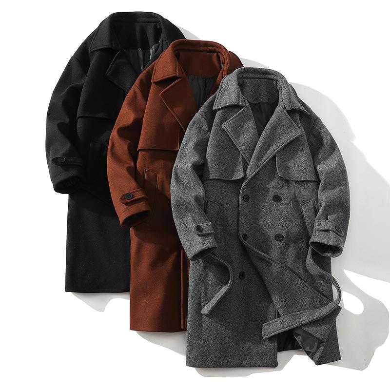 Herren Neutraler Doppelreiher Wollmantel Mittellang Locker Schnürung Windbreaker Design Jacke Herren