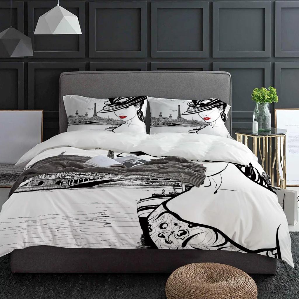 Bettwäsche-Set „Paris Seine Woman Eiffel Tower Red Lips“, 3-teilig, bestehend aus Bettbezug, Kissenbezug und Bettüberzug, Doppelbett-Set, Heimtextilien