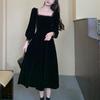 Kleines französisches schwarzes Kleid im Hepburn-Stil - Neuer Frühling/Herbst A-Linien Puffärmel Quadratischer Ausschnitt Midilänge Rock Trend