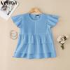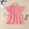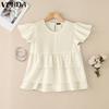 VONDA Elegant Women O Neck Short Sleeve Layers Pleating Solid Casual Blouse