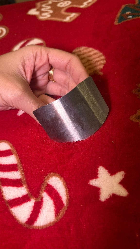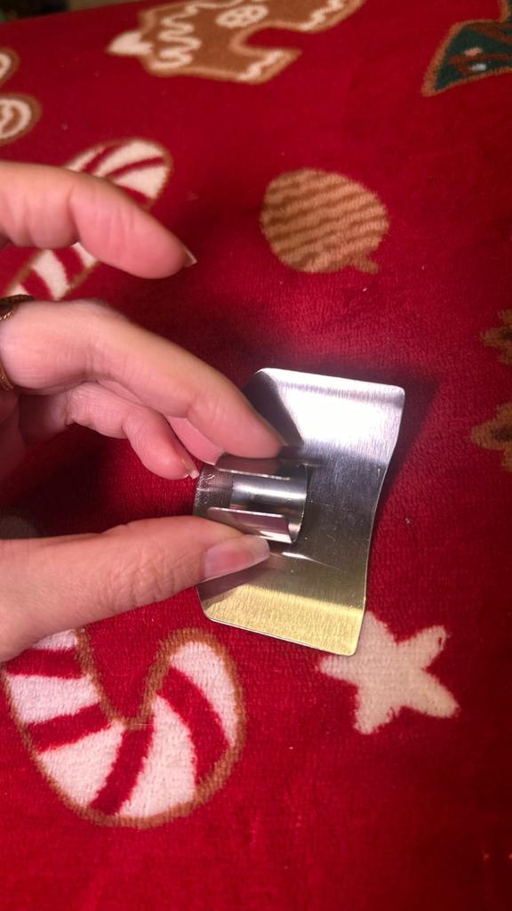 Verfügt über einen gebogenen Schutz, der Nägel und Fingerkuppen vor der Messerklinge schützt. Verstellbarer Ring: Auf der Rückseite befindet sich ein Metallring, der an die Größe des Mittelfingers angepasst werden kann und es ermöglicht, das Lebensmittel festzuhalten, während das Messer gegen den Schild gleitet.