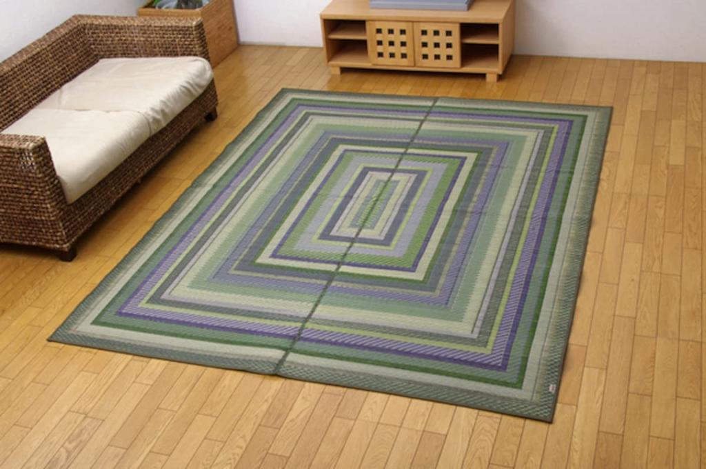 ●The delicate pattern is created using a technique called "bag weaving," which uses a large number of warp threads. ●The complex bends mean that long rush grass must be used or it will break. The dense warp threads make it sturdy and tear-resistant. ●Made with domestically grown (Kyushu) rush grass. Each strand is thick, with a thick outer skin and fine fibers, giving it elasticity and excellent durability. ●Rush grass has natural air purification and humidity control properties. It is also stain-resistant, and will develop a golden color over time, developing a unique character. ●The back is covered with non-woven fabric, making it suitable for use on flooring. ●The rush grass is treated with Aomori cypress. (Antibacterial and deodorizing)