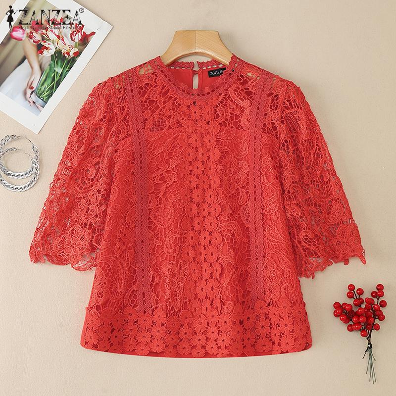 ZANZEA Damen Sommer Aushöhlen Spitze Häkeln Patchwork Kurzarm Bluse