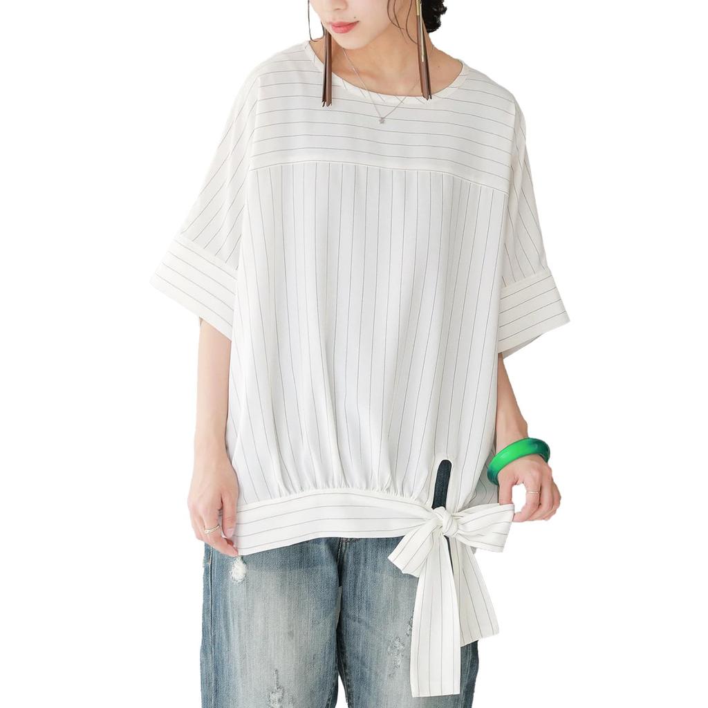 A loose striped blouse with a ribbon accent at the hem. A unique piece that adds a touch of style to casual adult outfits.